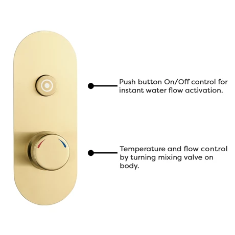 The stylish Arezzo industrial-style brushed brass 1 touch push button smart control shower package with 300mm wall mounted shower head is perfect for adding a striking finishing touch to your contemporary bathroom. Features easy to use instant 1 touch push button start/stop water flow activation. Temperature and flow is easily adjusted by simply turning the mixing valve. Crafted to the highest standards, this stunning shower valve features a round knurled textured tap head controls, perfect for creating an eye catching industrial look in your bathroom. Plated in a brushed brass finish which is highly resistant to corrosion. This ‘twin’ shower valve is perfect for installing in a concealed arrangement.