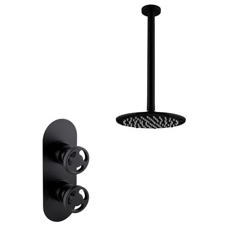 This Arezzo matt black industrial-style round concealed thermostatic valve features a stripped-down aesthetic with round knurled textured tap heads, perfect for creating an eye catching industrial look in your bathroom. Offers thermostatic showering via two easy-to-operate controls for temperature and flow. The valve body comes with a contemporary curved face plate and has been constructed from solid brass. Supplied with matching ceiling mounted matt black round fixed shower head with swivel joint and arm.