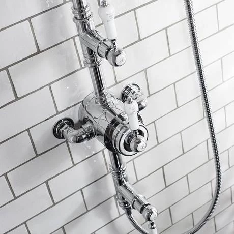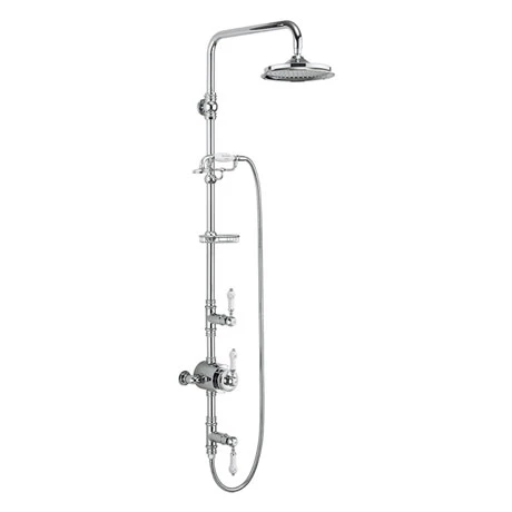 The Stour Thermostatic Exposed Two Outlet Shower Valve, Rigid Riser, Hose & Handset with Fixed Shower Head epitomises elegance with its traditional design. This shower package comprises of a thermostatic dual function brass valve with 2 independent on/off controls and central temperature control, fixed cradle, 1500mm shower hose and handset with ceramic handle, 28mm diameter vertical brass shower riser with soap basket and a choice of a 6, 9 or 12″ AirBurst shower head.