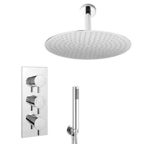 Enjoy versatile showering every single day with this Cruze Shower Package. Lather up under a luxurious rainfall fixed shower head then rinse using the handheld spray. Since there’s a separate knob for each, you can also use both at the same time. The 3 outlet shower valve plate features sleek round handles to provide a minimalist, modern look. You can mount these horizontally or vertically depending on your set up. The ceiling mounted fixed head and wall mounted pencil handset are easy to clean, even if you’re tackling limescale.