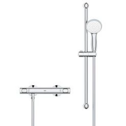The Grohe Grohtherm 1000 Thermostatic Shower Mixer is a safe and cost-effective solution for your family bathroom. Ideal for children, it features technology that keeps the tap body cool to avoid scalding and a SafeStop Plus button to prevent the water temperature from exceeding 50°C. The mixer’s EcoButton also helps reduce water consumption without affecting your shower experience. The kit includes a shower rail, hose and handset featuring two sprays.