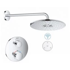 This complete Grohtherm SmartConnect round shower set from Grohe offers a showering experience with comfort and convenience. Switch between or combine two spray patterns without having to reach up to the shower head thanks to the wireless remote control, which can be placed anywhere. The head shower has two different spray patterns – the gentle, relaxing GROHE PureRain spray and the invigorating GROHE ActiveRain, strong enough for rinsing out shampoo and targeted enough to offer a stimulating head, neck and back massage. These spray patterns can be used individually, or combined.