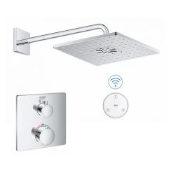 This complete Grohtherm SmartConnect square shower set from Grohe offers a showering experience with comfort and convenience. Switch between or combine two spray patterns without having to reach up to the shower head thanks to the wireless remote control, which can be placed anywhere. The head shower has two different spray patterns – the gentle, relaxing GROHE PureRain spray and the invigorating GROHE ActiveRain, strong enough for rinsing out shampoo and targeted enough to offer a stimulating head, neck and back massage. These spray patterns can be used individually, or combined.