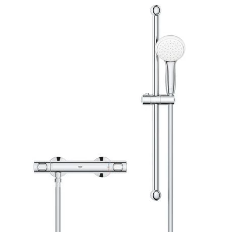 The Grohe Precision Flow Thermostatic Shower Mixer 1/2″ with Shower Set for Low Pressure is the perfect upgrade to the comfort of thermostatic showering. Ideal for low pressure systems with a minimum pressure of 0.5 bar, GROHE’s thermostatic cartidge ensures a constant supply of water at the perfect temperature with no unpleasant fluctuations. GROHE EcoJoy reduces water and energy consumption – and when you need a full flow just press the EcoButton to release the handle. It’s family-friendly too as the GROHE SafeStop override button is set at 38° C to prevent especially children from unintentionally turning up the water temperature too high. The optional GROHE SafeStop Plus temperature limiter can be set to limit to 43° C for an extra level of protection.