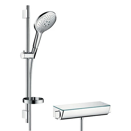 The hansgrohe Raindance Select S 150 with Ecostat Select Thermostatic Shower Mixer is an all-in-one shower system that offers an indulgent showering experience. The hand shower offers three different spray patterns: The RainAir soft shower spray produces soft beads of water that are enriched with air. The CaresseAir massage spray leaves you feeling invigorated thanks to the impact of 5 intensive individual sprays. The Mix full shower function completes the range of spa features, with a combination of both spray types. The integrated glass shelf offers practical space for shampoo and shower gel bottles. Easy to maintain, the shower head’s QuickClean nubs detach limescale deposits to keep its spray powerful each and every time.
