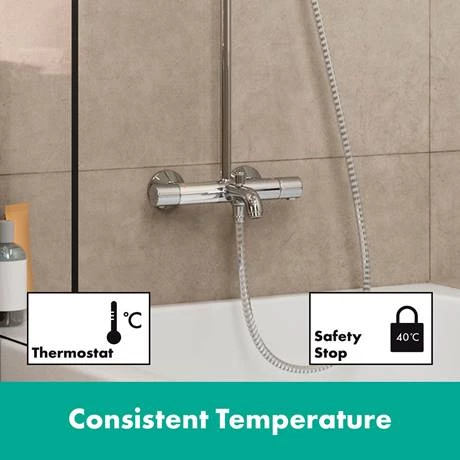 The Vernis Blend Showerpipe 200 Thermostatic Bath Shower Mixer combines a hand and overhead shower with a bath filler into one product. It features a swivelling 205mm shower head and shower handset with a height-adjustable shower holder that can also be turned and tilted. The self-locking slider can be operated with one hand. The QuickClean rub clean nubs loosens any limescale deposits making sure your hand shower looks beautiful, and stays working for longer. The easy to use diverter switches effortlessly between the head shower, handset or bath spout.
