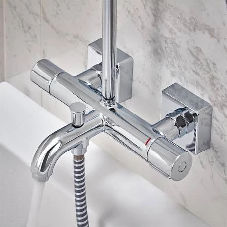 The Vernis Shape Showerpipe 230 Thermostatic Bath Shower Mixer combines a hand and overhead shower with a bath filler into one product. It features a swivelling 205mm shower head and shower handset with a height-adjustable shower holder that can also be turned and tilted. The self-locking slider can be operated with one hand. The QuickClean rub clean nubs loosens any limescale deposits making sure your hand shower looks beautiful, and stays working for longer. The easy to use diverter switches effortlessly between the head shower, handset or bath spout.