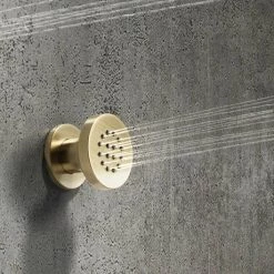 Arezzo Brushed Brass Round Shower System with Diverter, Fixed Shower Head + 4 Body Jets
