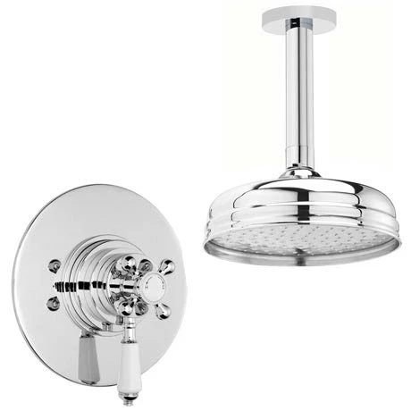 A beautiful Victorian inspired concealed shower package; includes a traditional dual concealed thermostatic shower valve with a ceiling mounted 8 inch rainfall shower rose. Create your own period bathroom with our quality complete shower packages, manufactured from solid brass with a stunning polished chrome finish.